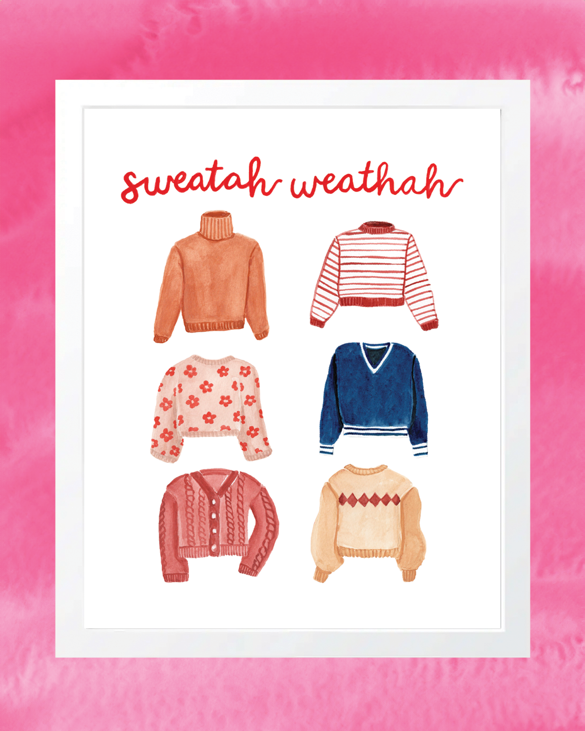 Celebrate cozy season with the Sweatah Weathah 8x10 Art Print, capturing the playful charm of a Boston accent. Perfect for fall vibes, this art print brings warmth and humor to any room!